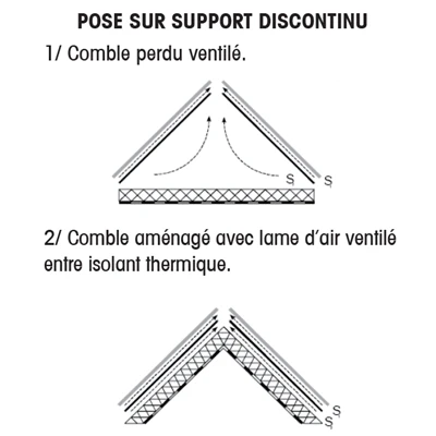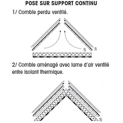 - Pose tendue sur chevrons ou fermettes d’entraxe maximal de 90 cm, ou pose ventilée en sous-face sur support continu.